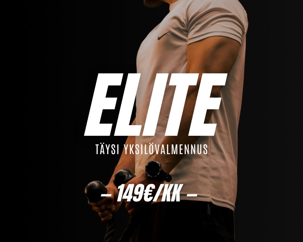 Vaativimmille tavoitteille ELITE-valmennus tarjoaa kokonaisvaltaisen, tiiviin yhteistyön: henkilökohtaisen ravinto- ja harjoitteluohjelman, jatkuvat päivitykset, viikoittaisen raportoinnin sekä suoran yhteyden valmentajaan. Tämä on valmennusta sinulle, joka haluat maksimoida potentiaalisi ja saada täyden tuen matkallesi.